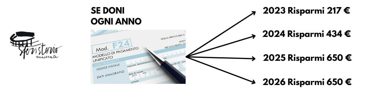 Le erogazioni liberali in denaro possono essere effettuate per interventi di manutenzione, protezione e restauro di beni culturali pubblici, per il sostegno degli istituti e dei luoghi della cultura di appartenenza pubblica e per la realizzazione di nuove strutture, il restauro e il potenziamento di quelle esistenti, delle fondazioni lirico-sinfoniche o di enti o istituzioni pubbliche che, senza scopo di lucro, svolgono esclusivamente attività nello spettacolo, come il nostro Sferisterio, Teatro di Tradizione.