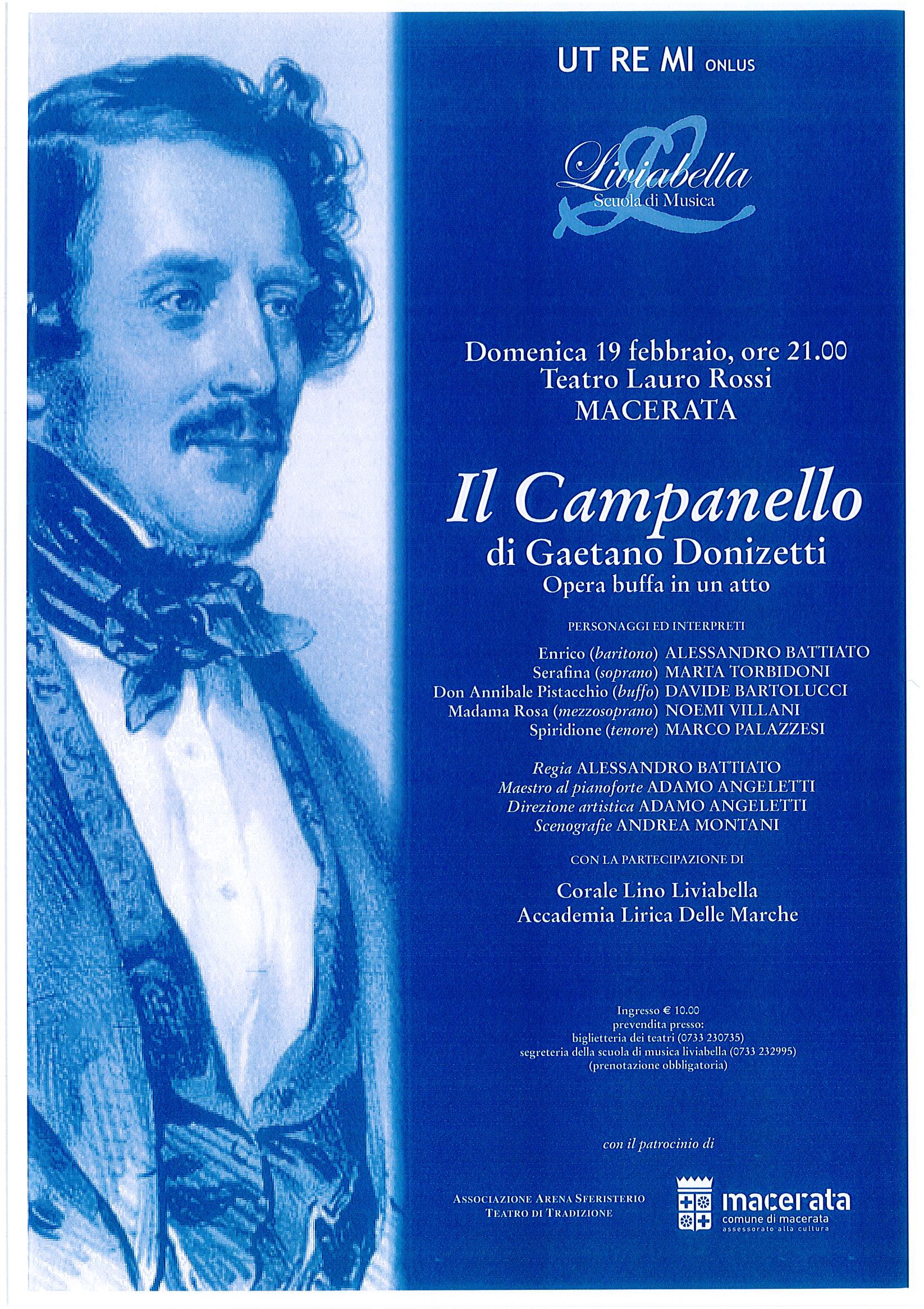Un’opera lirica brillante e divertente. E’ Il campanello, la farsa in un atto di Gaetano Donizetti nota anche con i titoli Il campanello di notte e Il campanello dello speziale, in scena domenica prossima (19 febbraio) al teatro Lauro Rossi grazie ad un’iniziativa organizzata dall’associazione culturale Ut Re Mi e dalla Scuola di musica Liviabella con il patrocinio del Comune di Macerata e dell’Associazione Sferisterio.